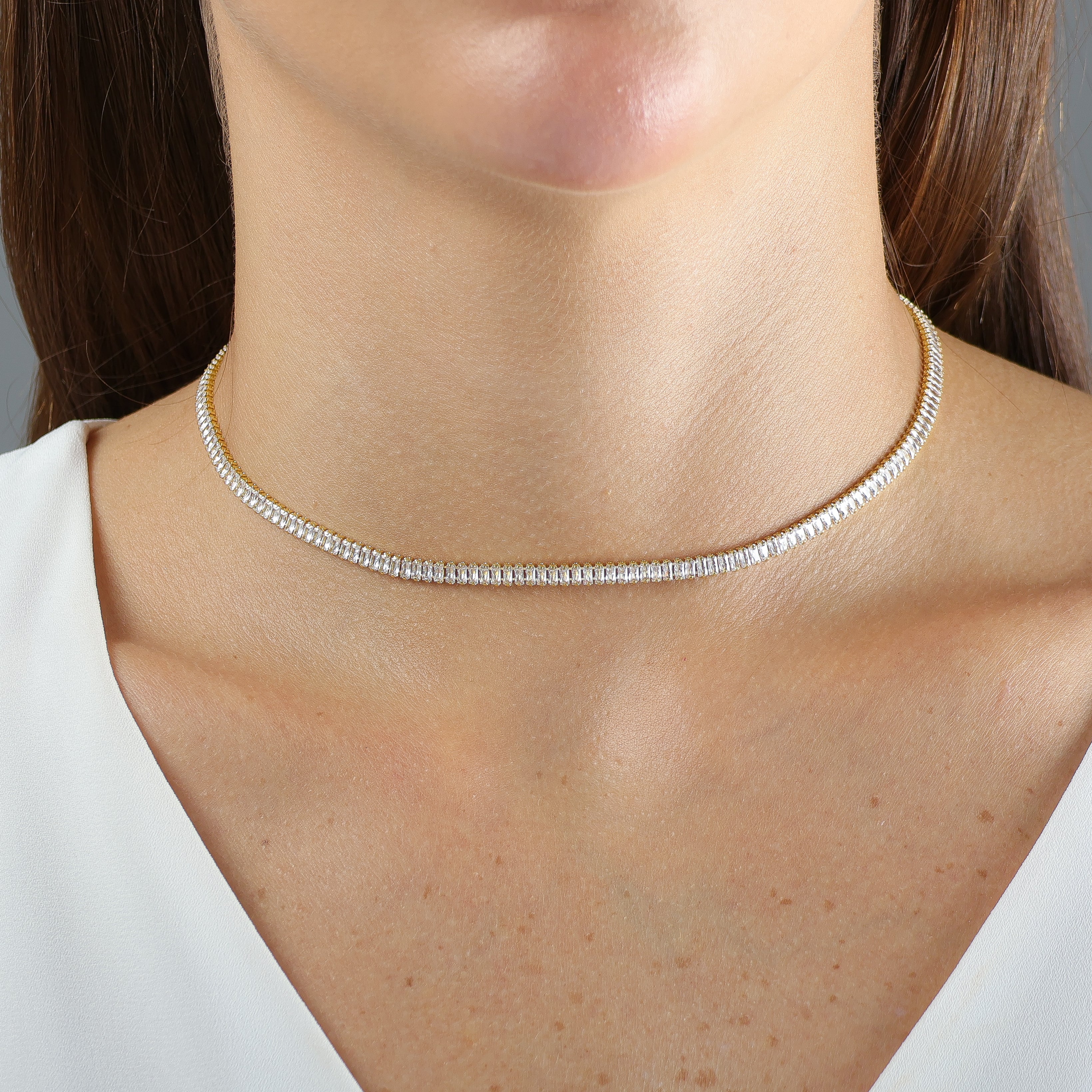 Um clássico repaginado com brilho impressionante. O choker Adriana traz uma fileira contínua de zircônias em cravação rente, que reflete a luz com intensidade e sofisticação. Com design elegante e acabamento impecável, é a peça ideal para quem busca um acessório marcante e versátil — capaz de elevar desde looks noturnos até composições mais casuais com um toque de glamour.