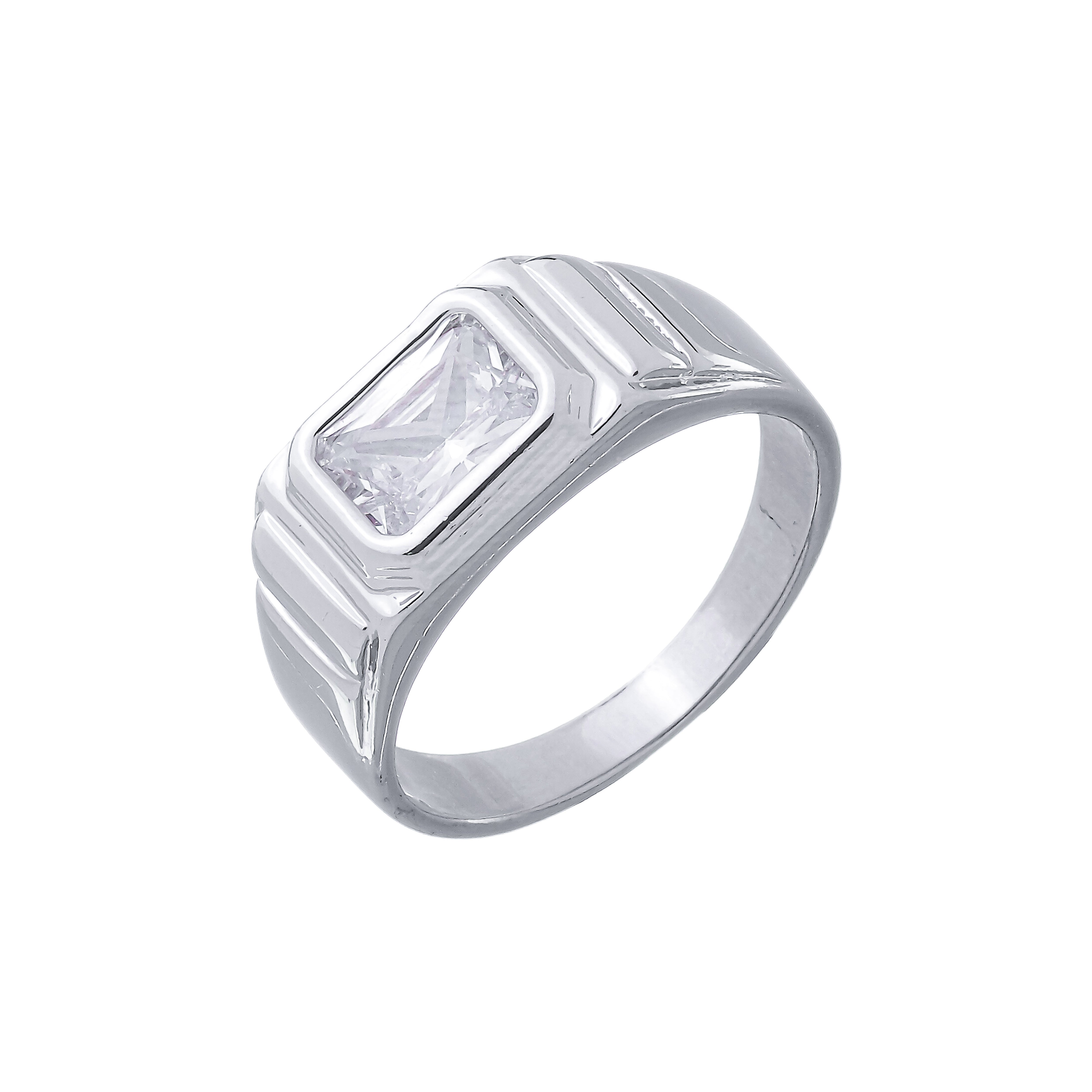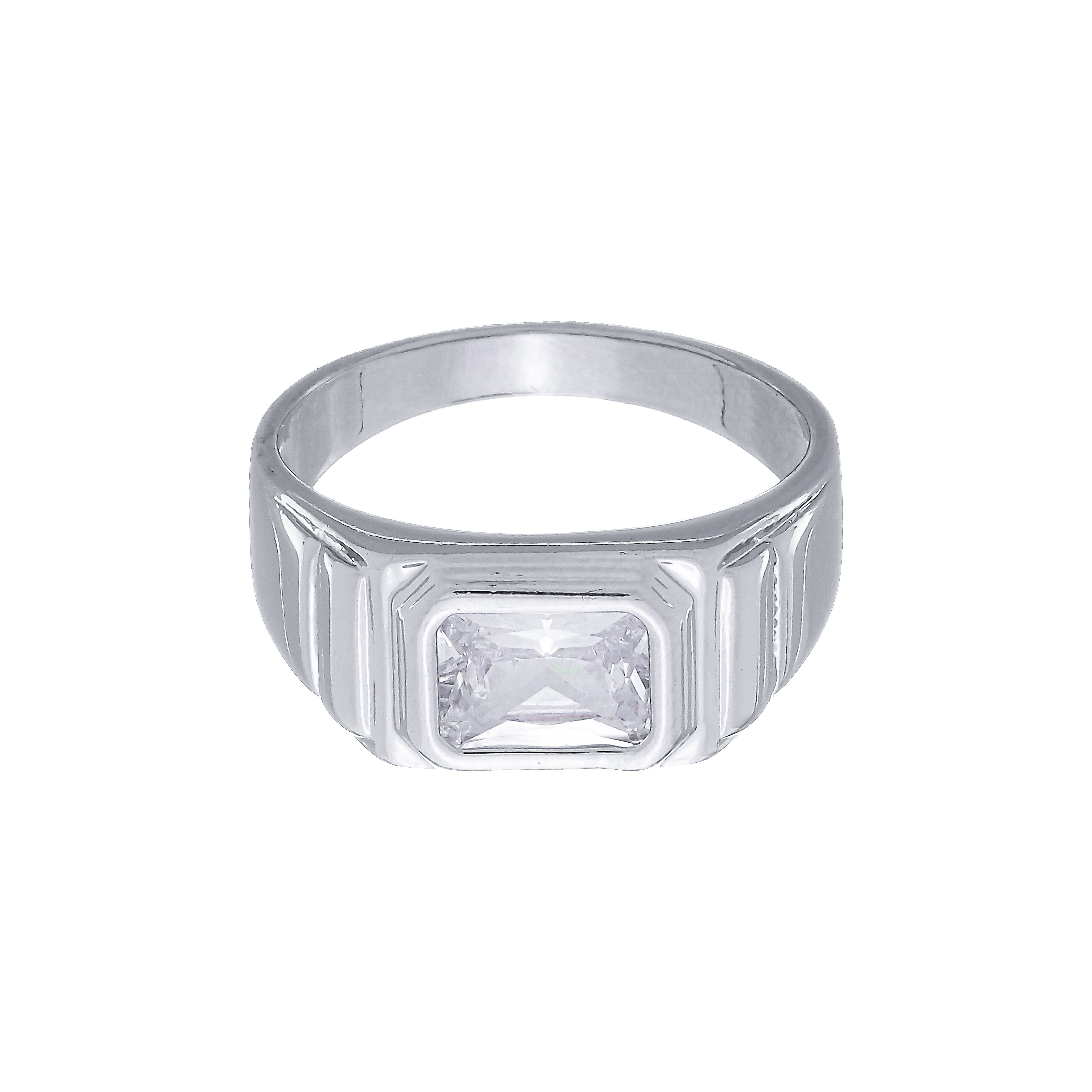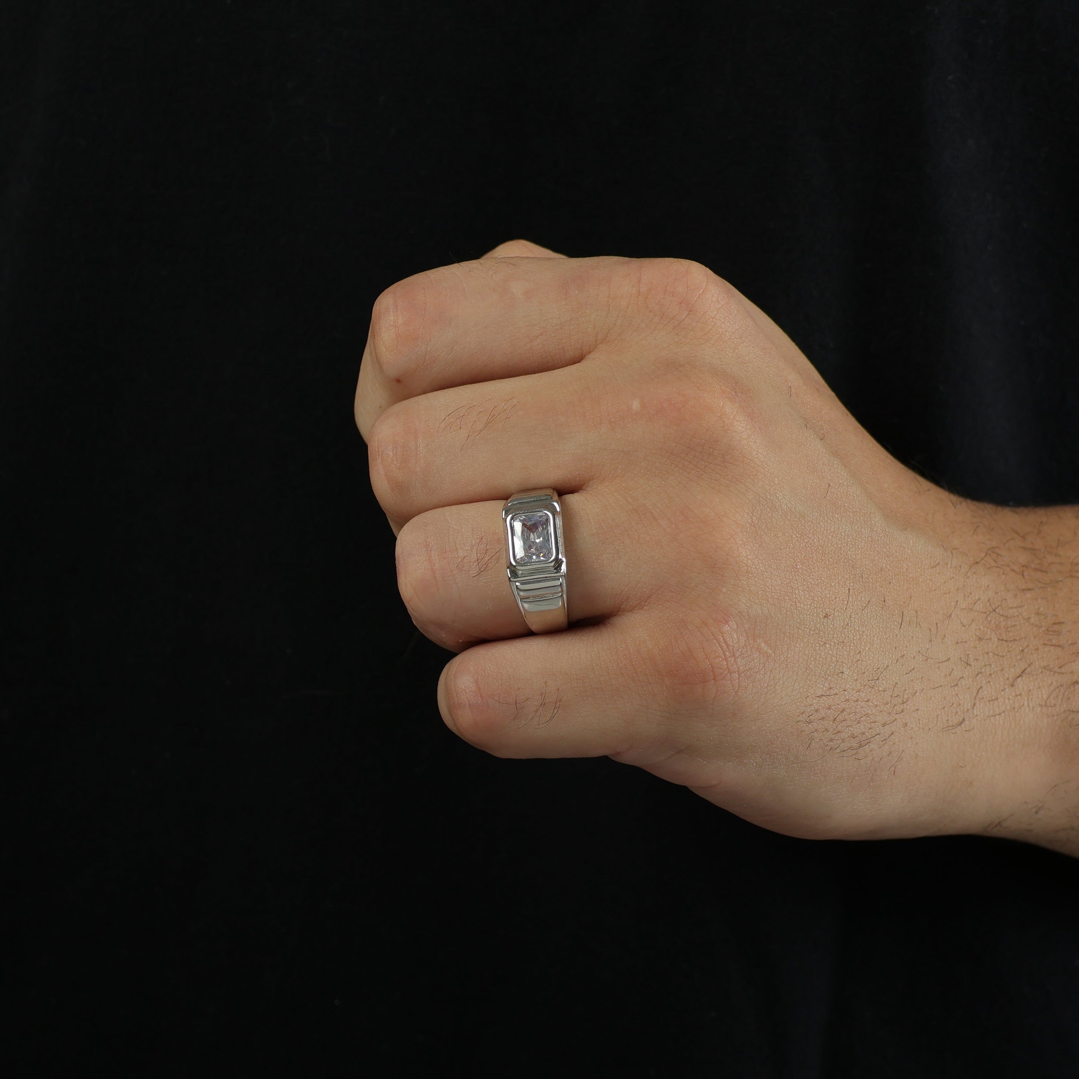 Com visual imponente e linhas bem definidas, o anel Bruno aposta em uma zircônia retangular central para criar um ponto de brilho elegante e discreto. A estrutura espessa e o acabamento polido completam o design com personalidade e presença.