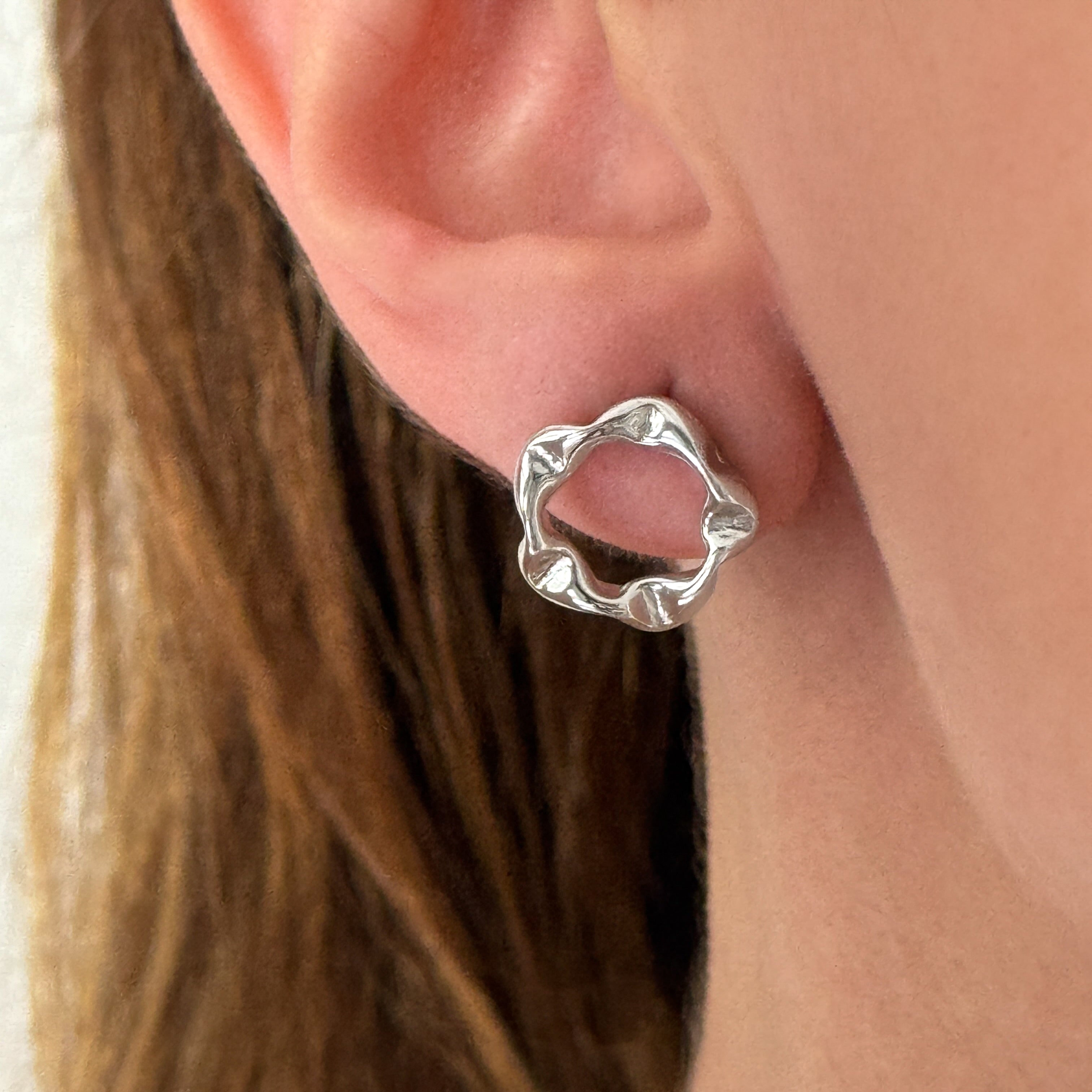 • Brinco pequeno vazado com textura ondulada;