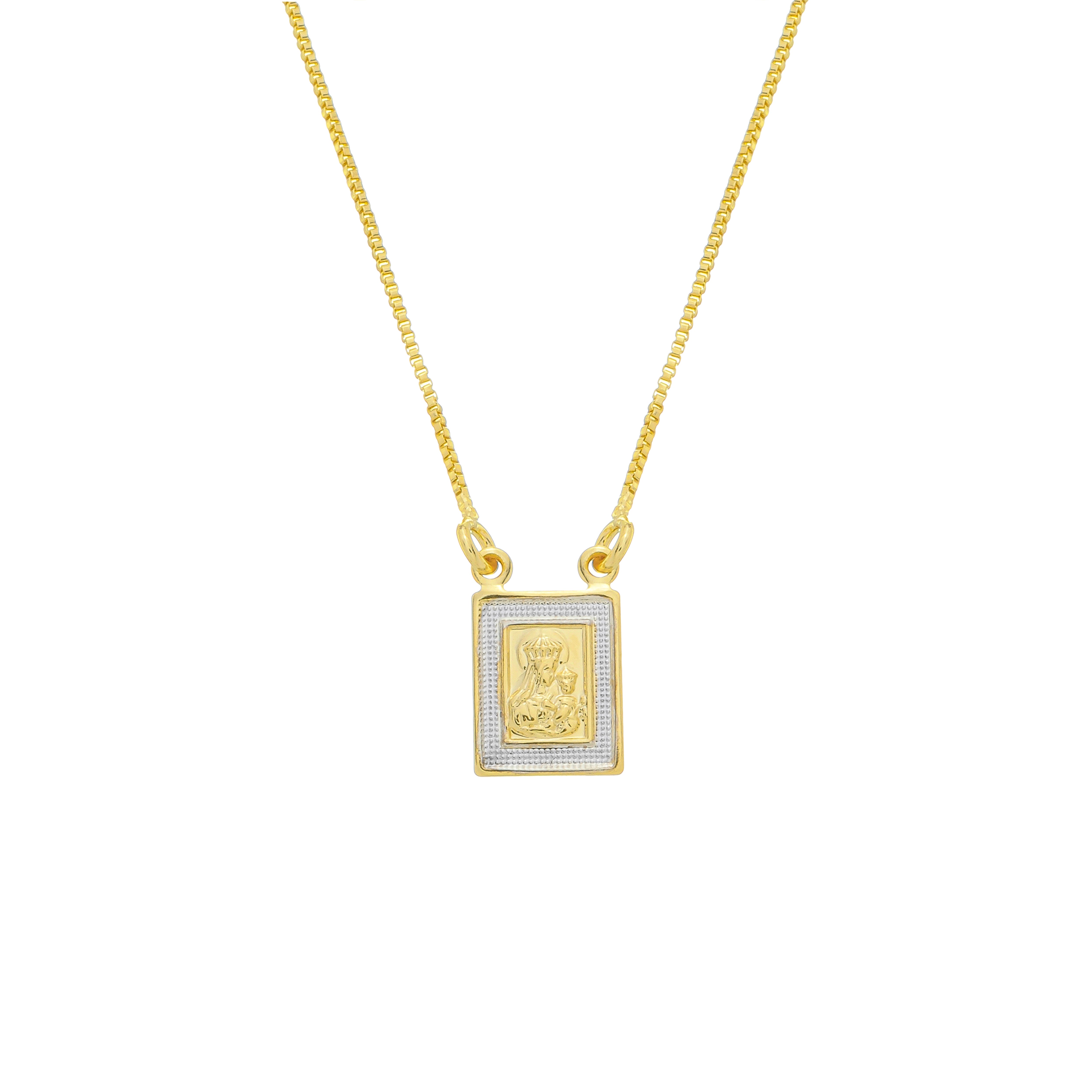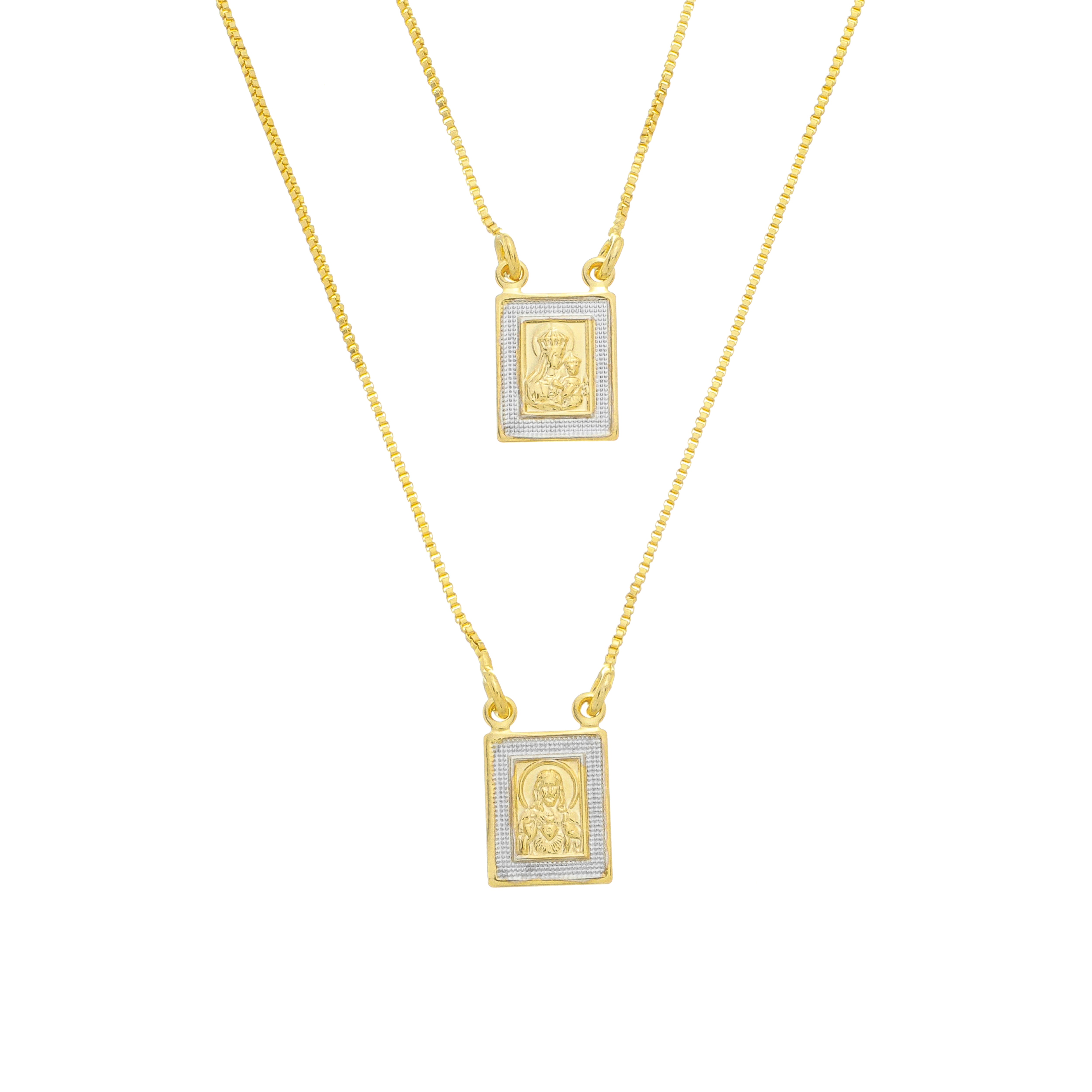 Um clássico da joalheria religiosa, o escapulário do Sagrado Coração de Jesus representa fé, proteção e conexão espiritual. Com moldura canetada em ródio branco que destaca o brilho das medalhas, essa versão traz sofisticação ao símbolo consagrado, unindo tradição e elegância em uma peça para usar todos os dias.