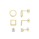 Kit de mini brincos banhados a ouro 18k, com design geométrico e minimalista. Perfeito para criar combinações exclusivas ou usar individualmente, trazendo sofisticação e leveza ao visual. Ideal para quem busca praticidade e estilo em peças delicadas para o dia a dia.