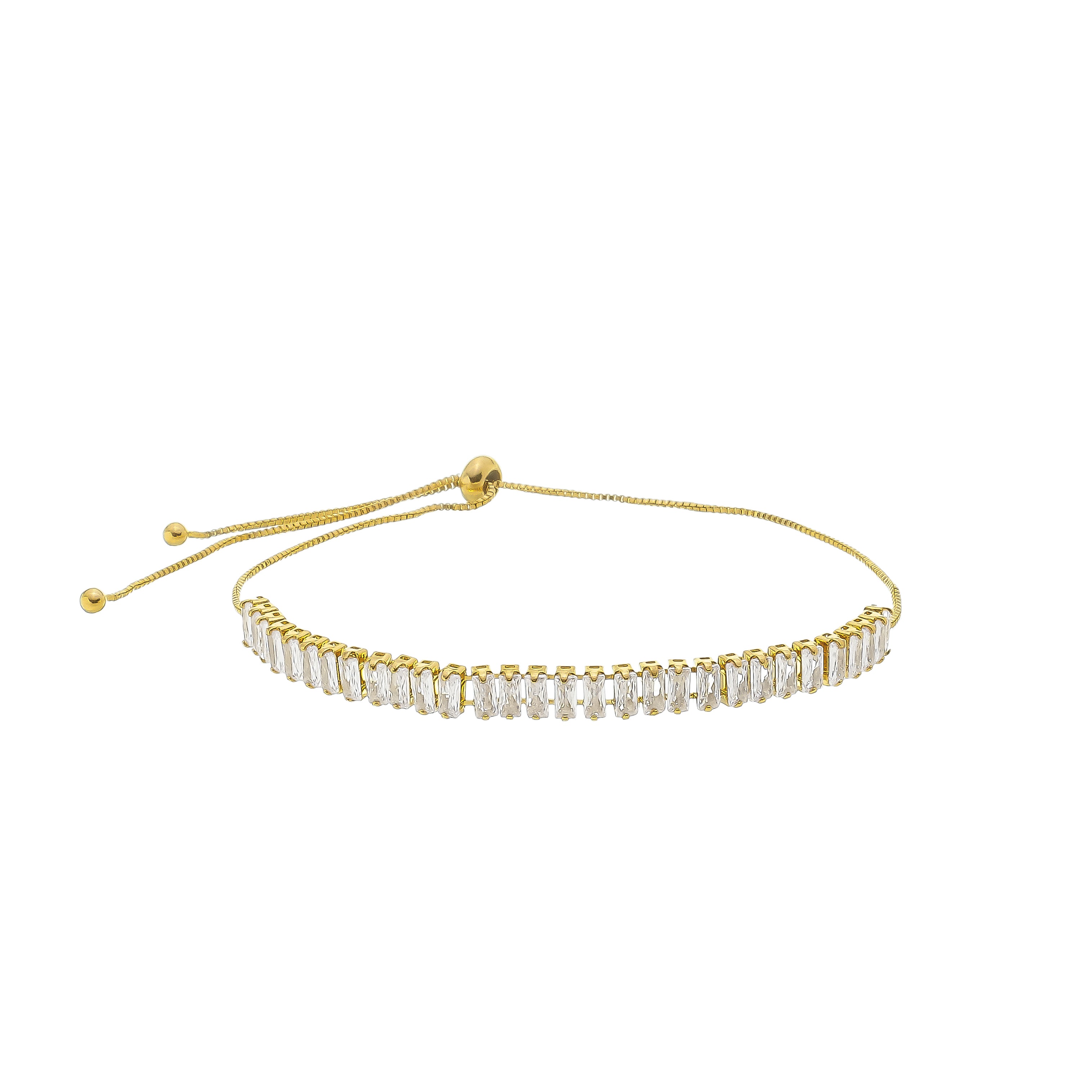 Pulseira banhada a ouro, com delicadas zircônias de brilho intenso. O design ajustável além de trazer praticidade e conforto, adiciona um toque de sofisticação e autenticidade à peça. Delicada, porém marcante, esta pulseira eleva qualquer produção.