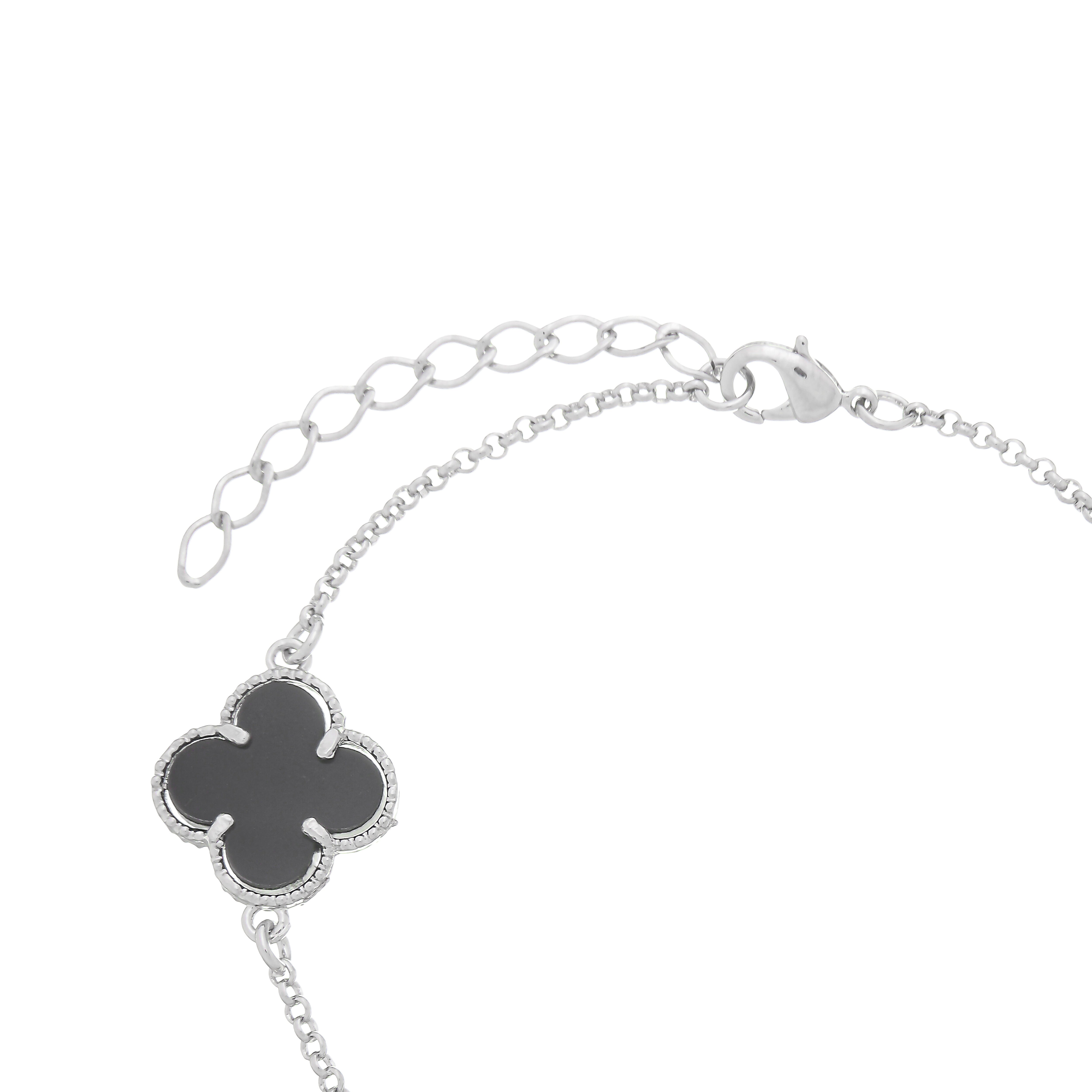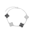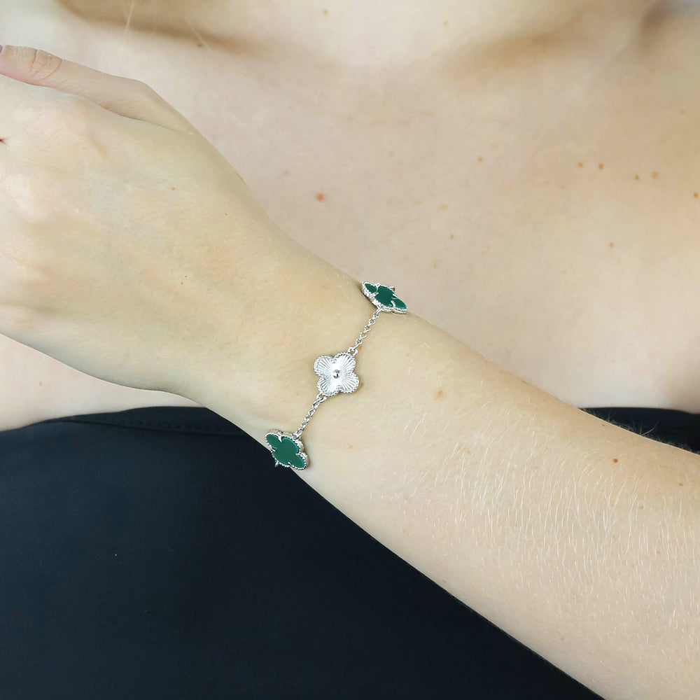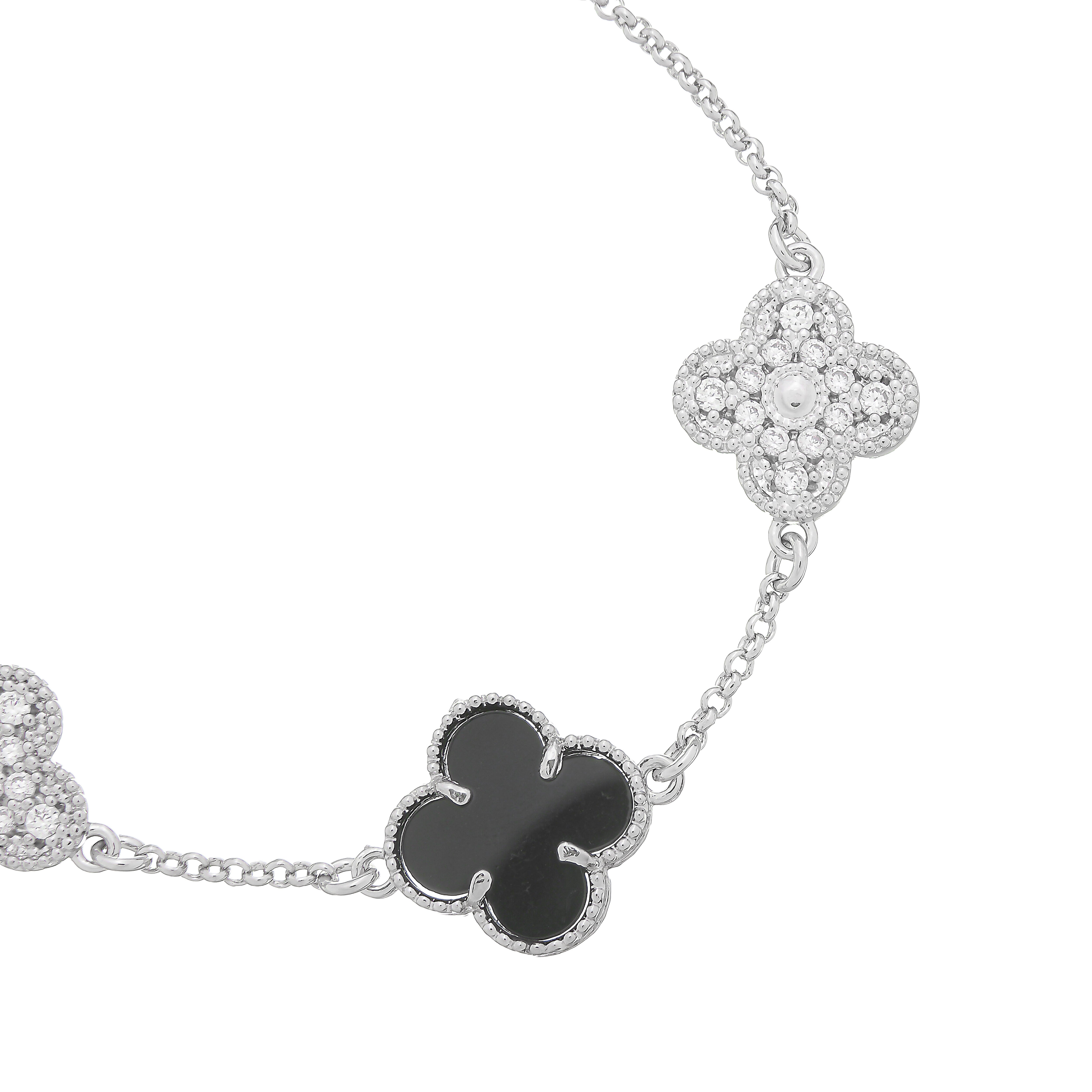 Marcante e sofisticada, esta pulseira é uma releitura do icônico modelo que combina delicados trevos pretos e trevos cravejados com micro zircônias brilhantes. Este modelo celebra o trevo de quatro folhas como símbolo de sorte, amor, saúde e riqueza, trazendo um toque de glamour atemporal para elevar suas composições.