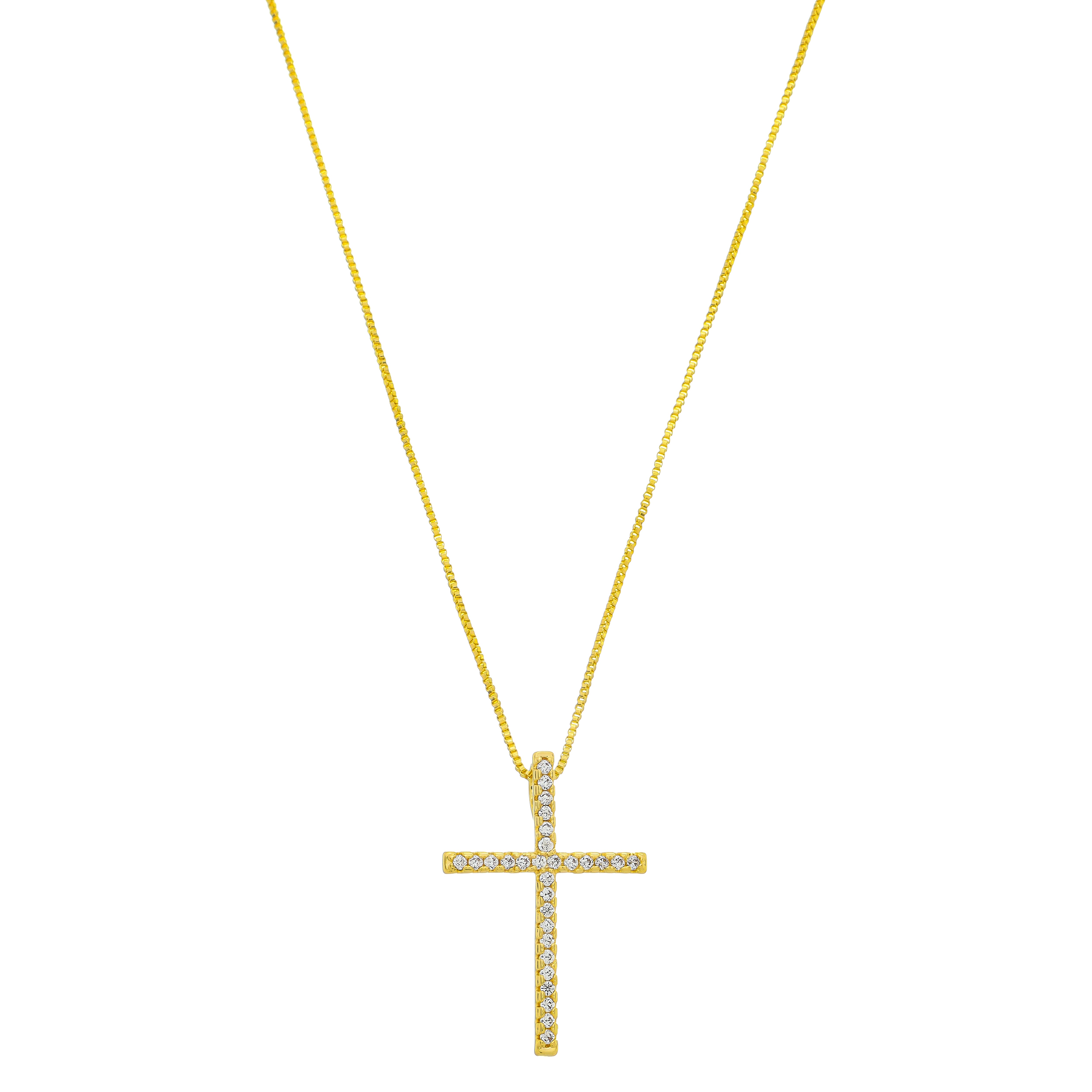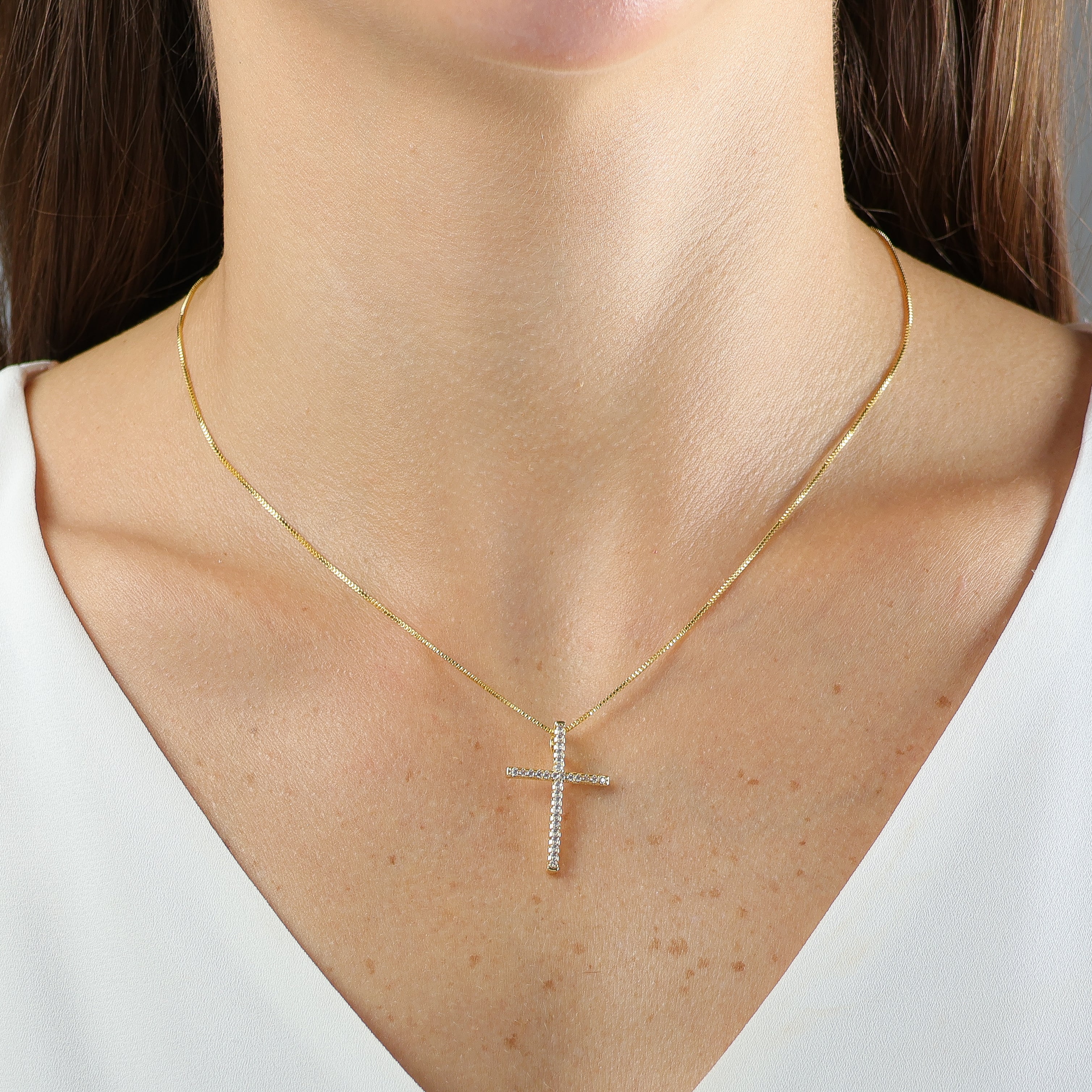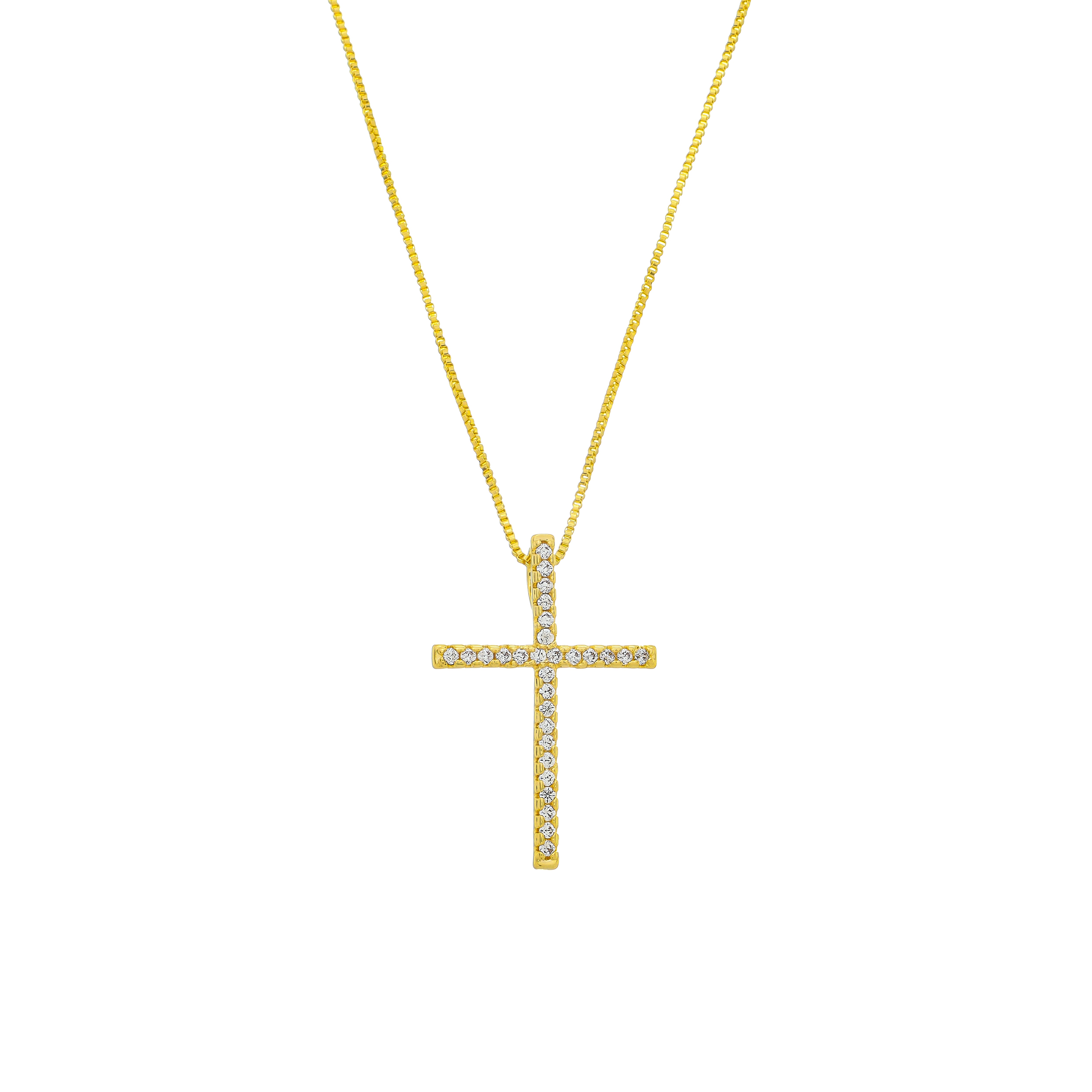 Com linhas clássicas e brilho marcante, o colar com cruz cravejada é uma peça que traduz fé com sofisticação. O pingente alongado, totalmente coberto por zircônias, cria um visual elegante e atemporal — perfeito para composições delicadas ou como destaque no colo.