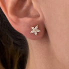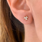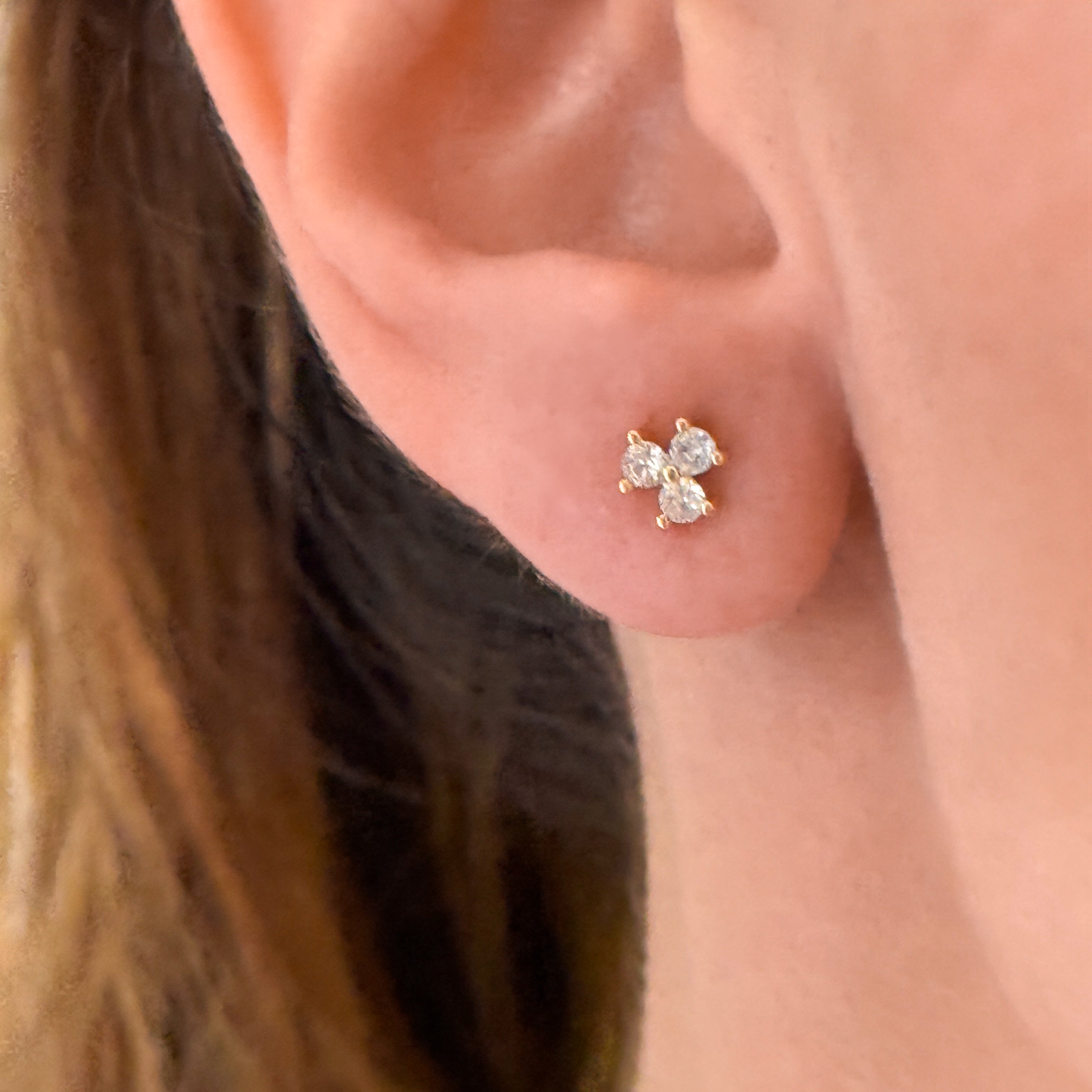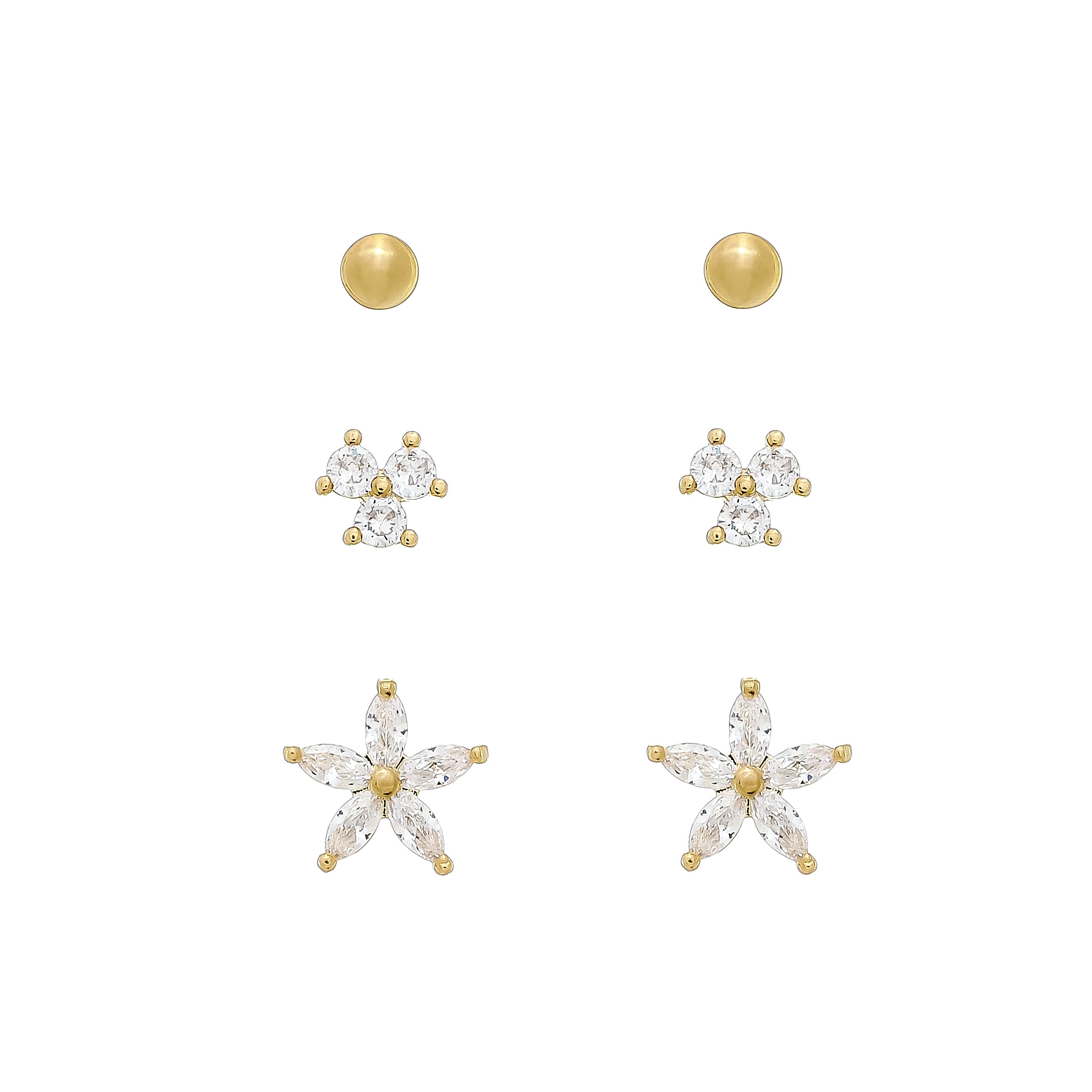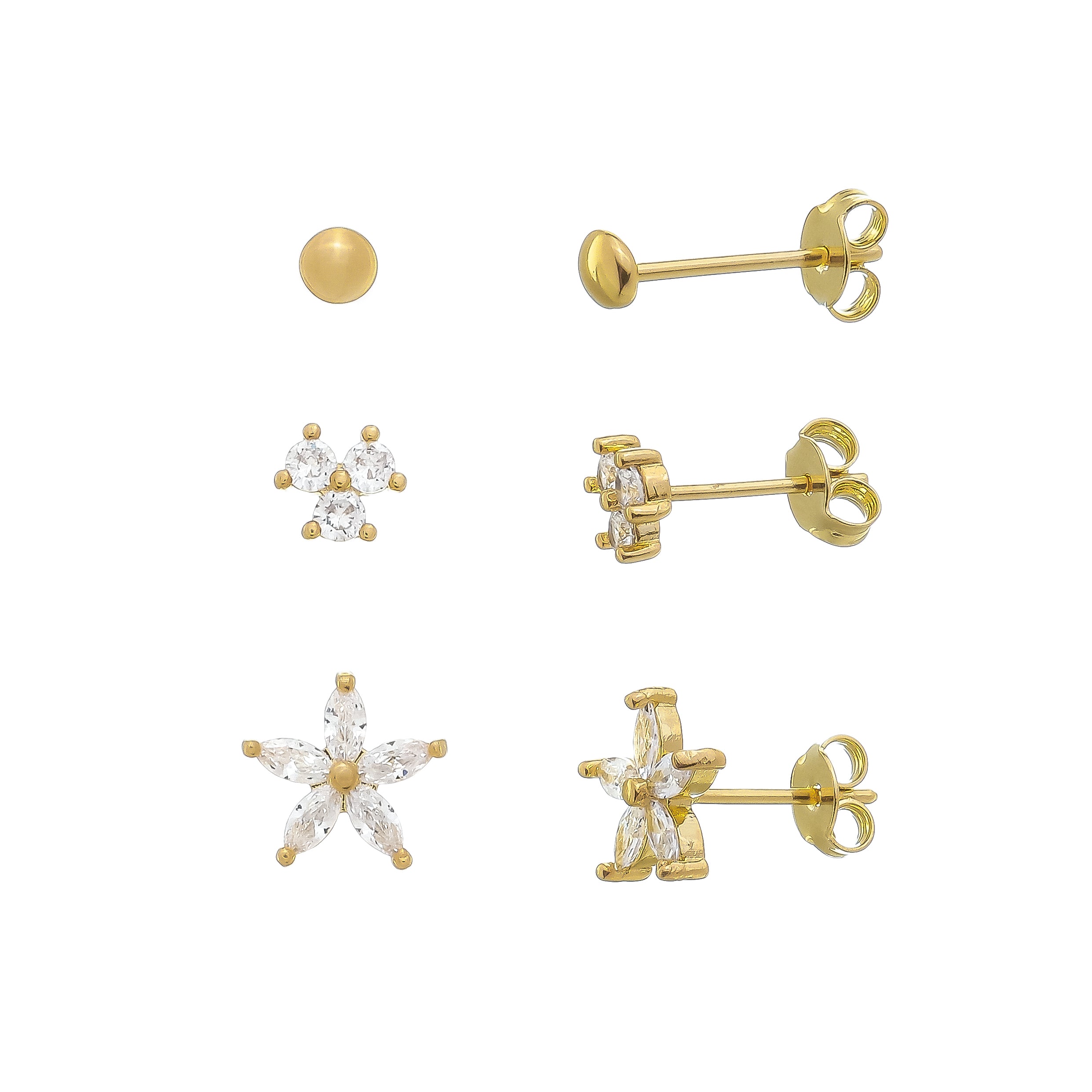 - Conjunto de mini brinco liso em formato de ponto, mini brinco com zircônias em formato de trevo e mini brinco com zircônias em formato de flor;