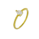 Refinado e encantador, o anel Anastasia combina o brilho da zircônia em corte de pera ao aro de esferas polidas, que adiciona leveza e um toque contemporâneo à peça. Um design que une delicadeza e presença — perfeito para composições elegantes e femininas.